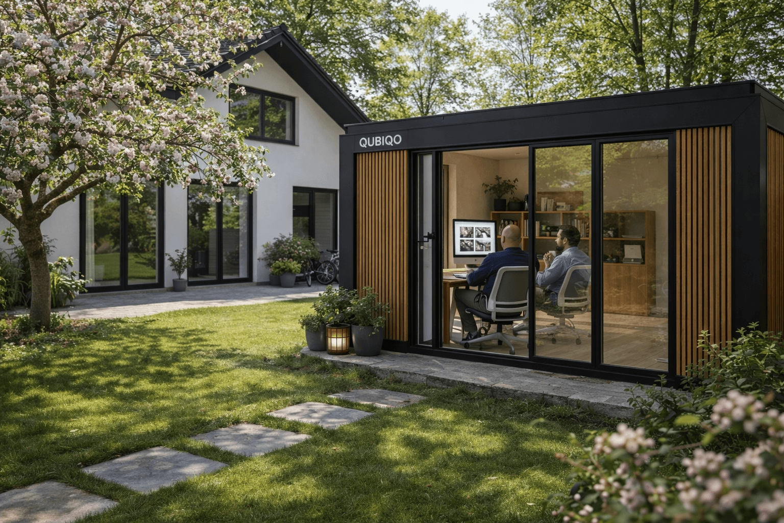 De QubiQo Office-unit is een volledig afgewerkt tuinkantoor met goede isolatie, klimaatregeling, daglicht en een inrichting die past bij serieus werken. Hij staat in zes weken. Geen langdurig bouwproces en geen open bouwput in de tuin voor maanden.